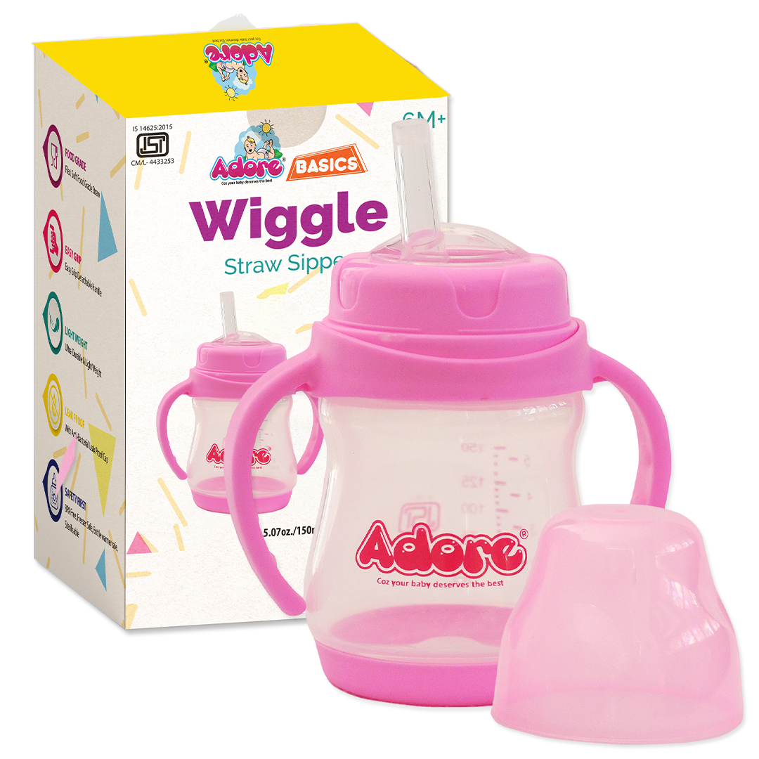 Adore Basics Wiggle Straw Sipper (150ml / 5.07 oz, 9M+) — Designed with care to make every sip safe and fun for your little one. Crafted with a Flexi Soft Food Grade Straw for gentle sipping, it features an Easy Grip Detachable Handle that helps tiny hands hold comfortably. The sipper is ultra-durable yet lightweight, built to withstand everyday use. Its anti-bacterial leak-proof cap ensures hygiene and mess-free travel. Completely BPA-free, freezer safe, bottle warmer safe, and sterilisable, the Adore Wiggle Straw Sipper combines safety, comfort, and convenience — making it the perfect choice for growing babies.