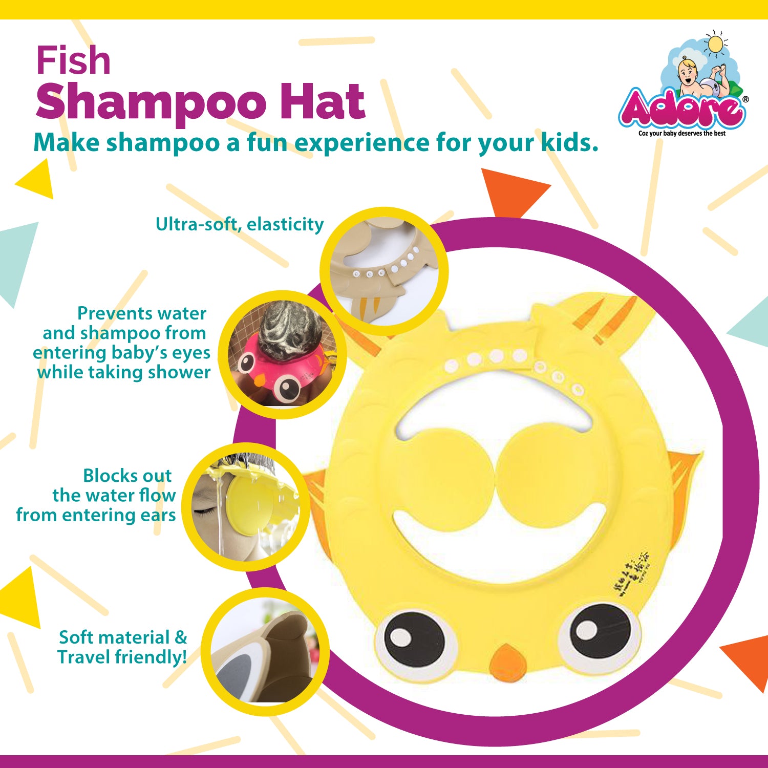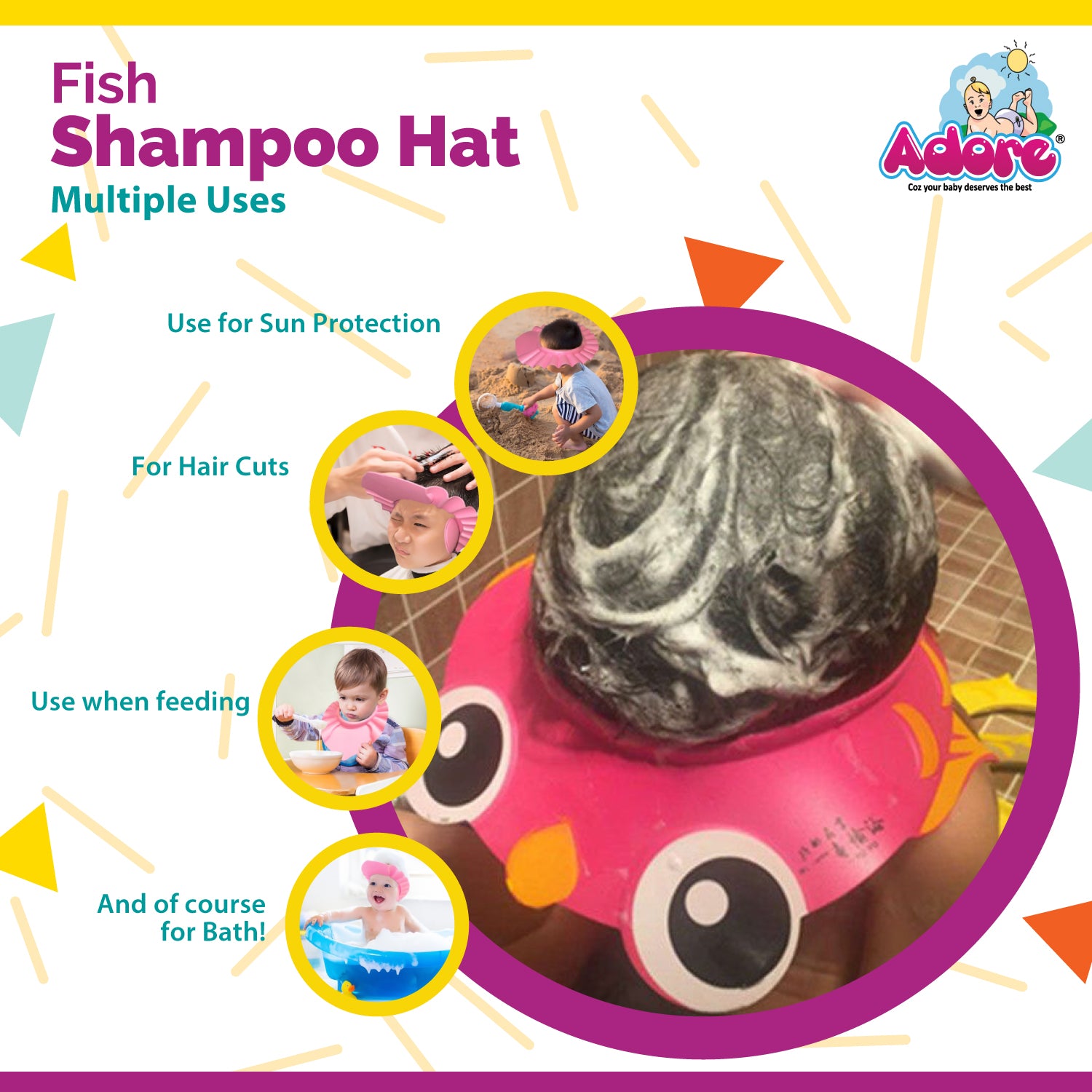 Adore Baby shower cap fits perfectly on baby's head and makes an airtight seal around head so that water does not flow on the face. It protects eyes from shampoo and water and also let baby breathe normally while water flowing down their heads. Moreover, the cap has side flaps which prevent water getting into ears. The cap can be adjusted with Button closure. You may use it during showers, normal daily bathing, as a sun protector or during outing.