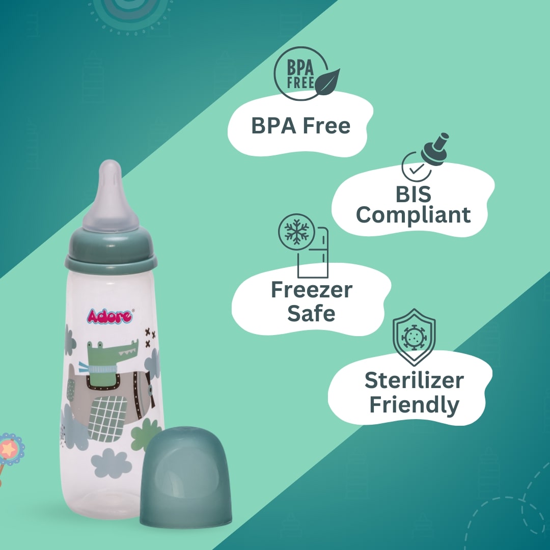 Adore Presents the all-new Premium England series of Feeding Bottle for babies that are meticulously crafted to the highest safety standards. These bottles are processed from premium food-grade materials that are safe for babies. It is also equipped with a Food-grade Premium Matte Finish Anti colic Silicone teat which is manufactured using world-class, state-of-the-art machinery. These bottles are super sleek, spill-proof, and easy to use on the go.