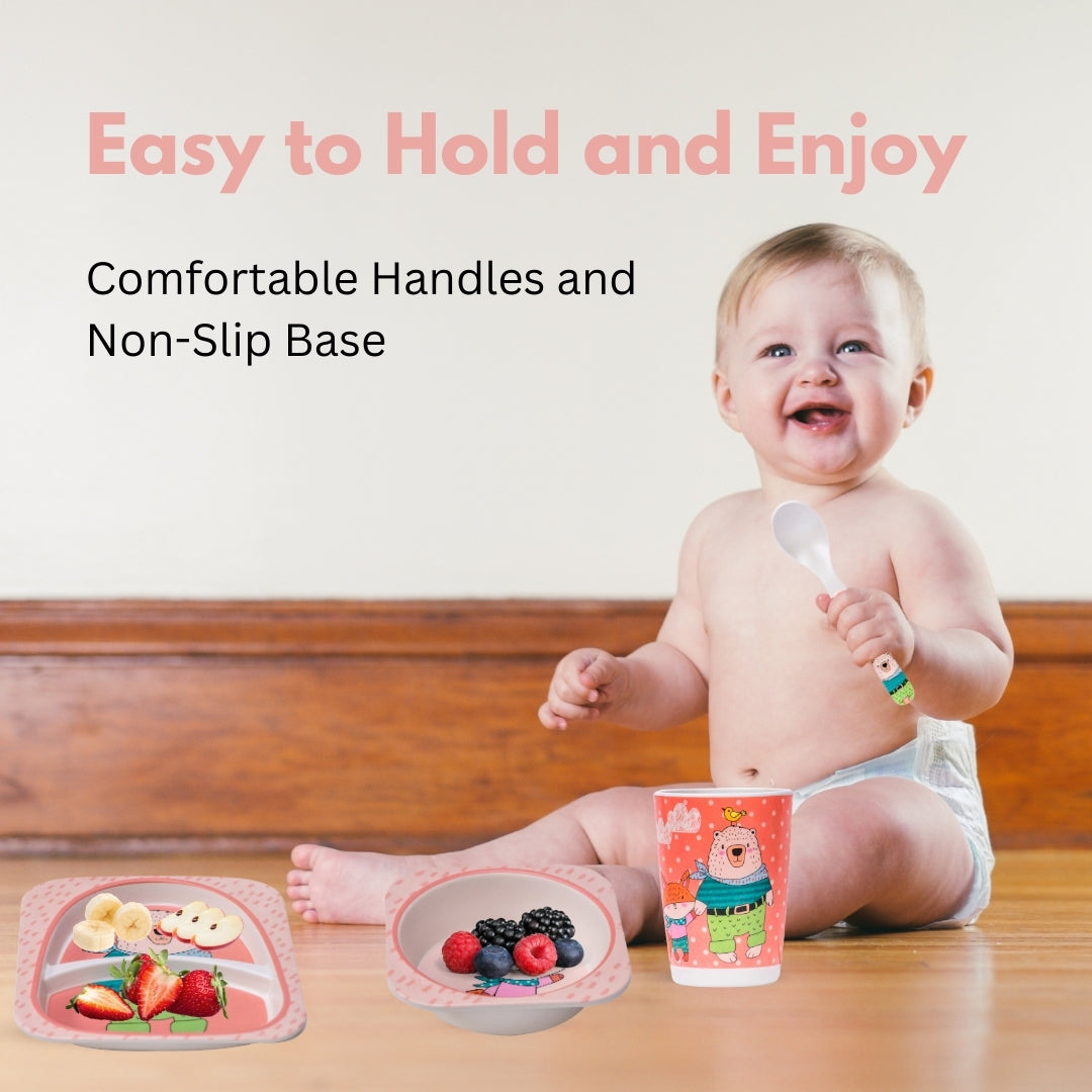 This dinner set comes with a divided plate, a large bowl, a fork, a spoon, and a tumbler. It is composed of premium, entirely non-toxic bamboo fibers. Fun tableware can often be all that's needed to make a meal more interesting for kids. With its deep walls on the plates and bowl, comfortable, easy-to-hold handles, grippy bottoms, and a rainbow of vibrant colors, this charming dining set from the Deepashri Collection is ideal for toddlers. These dinner sets are the ideal complement to any toddler-friendly table setting because they are dishwasher safe and BPA-free. This set elevates self-feeding to a new level because toddlers like eating like adults