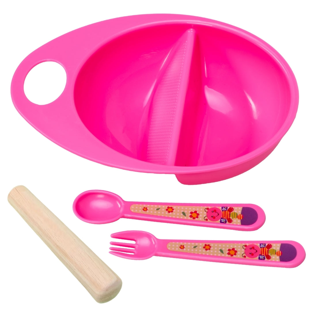 Adore Supper Hero Feeding Bowl with Spoon, Fork & Wooden Masher- Pink