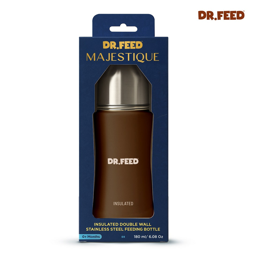 Adore® Dr.Feed Majestique Insulated Double Wall Stainless Steel Feeding bottles are crafted from 304 (18/8) SS Food Grade Material with a food Grade anti-colic Silicon Teat. The Double Insulated wall ensures the liquids inside is warm and cold for longer durations.