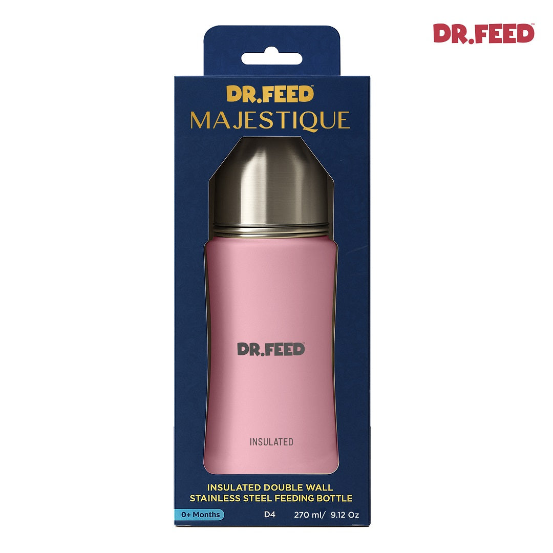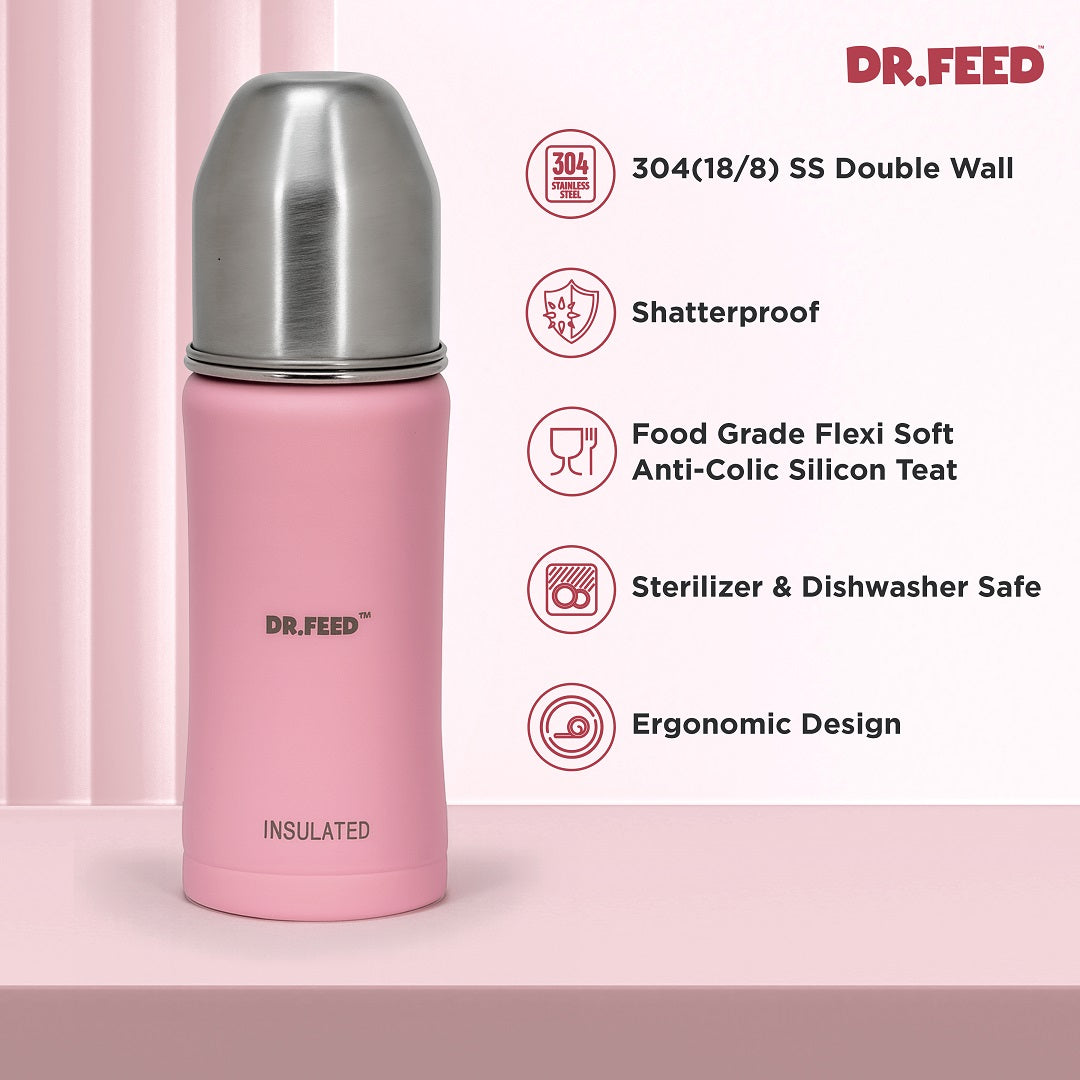 Adore® Dr.Feed Majestique Insulated Double Wall Stainless Steel Feeding bottles are crafted from 304 (18/8) SS Food Grade Material with a food Grade anti-colic Silicon Teat. The Double Insulated wall ensures the liquids inside is warm and cold for longer durations.