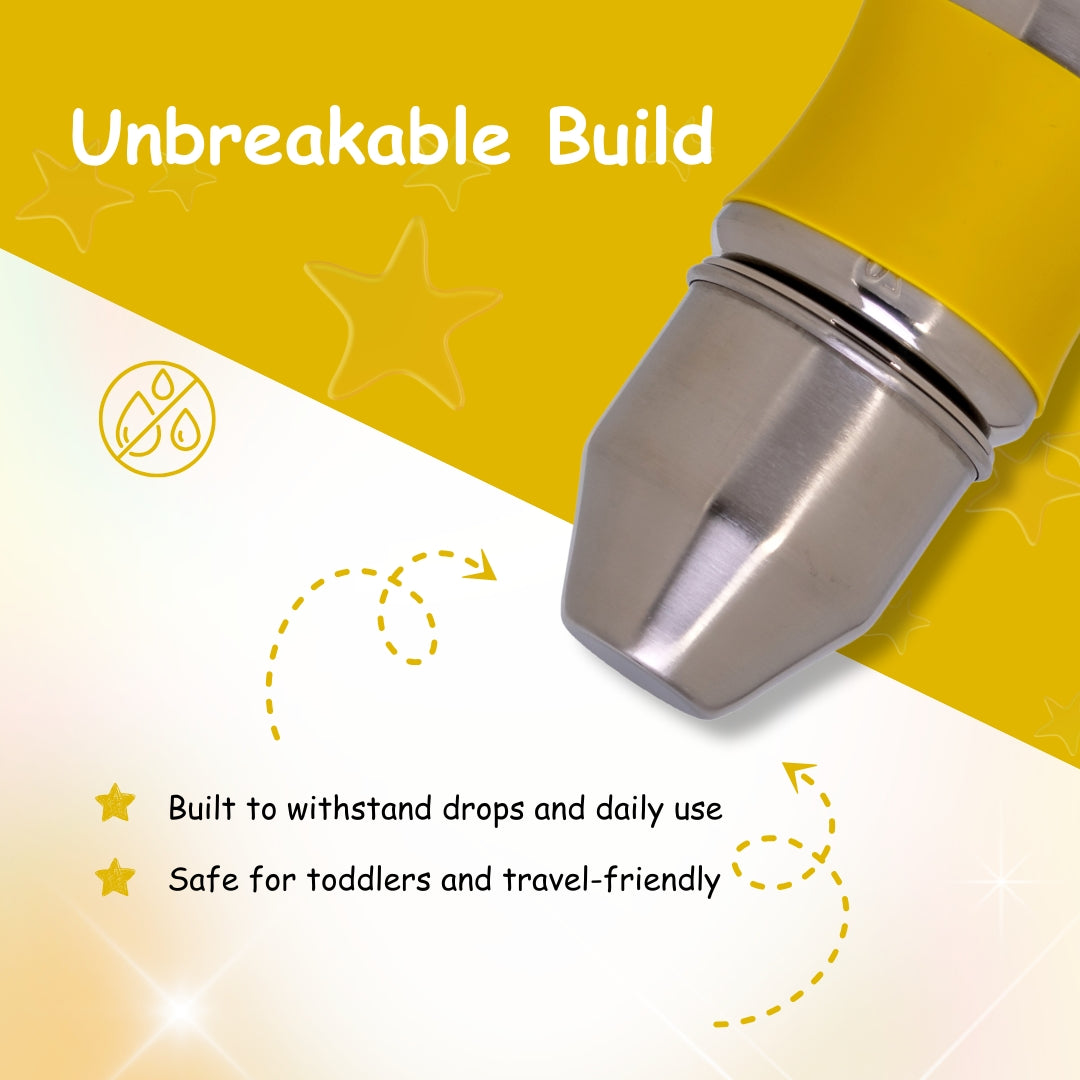 Adore® Twilight Jr. 2 Stage Stainless Steel Printed Sipper are manufactured from 304 (18/8) SS Food Grade Material with a Food Grade Spout and Silicone Gravity Ball Straw. Fix the Flexi soft silicone spout to use it as Spout Sipper. In Next stage, replace the Spout with Flexi soft Silicone straw to use it as a Straw Sipper. This bottle keeps growing with your baby to have a perfect feeding experience.