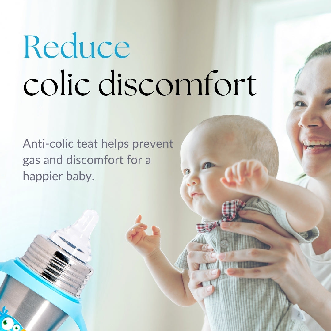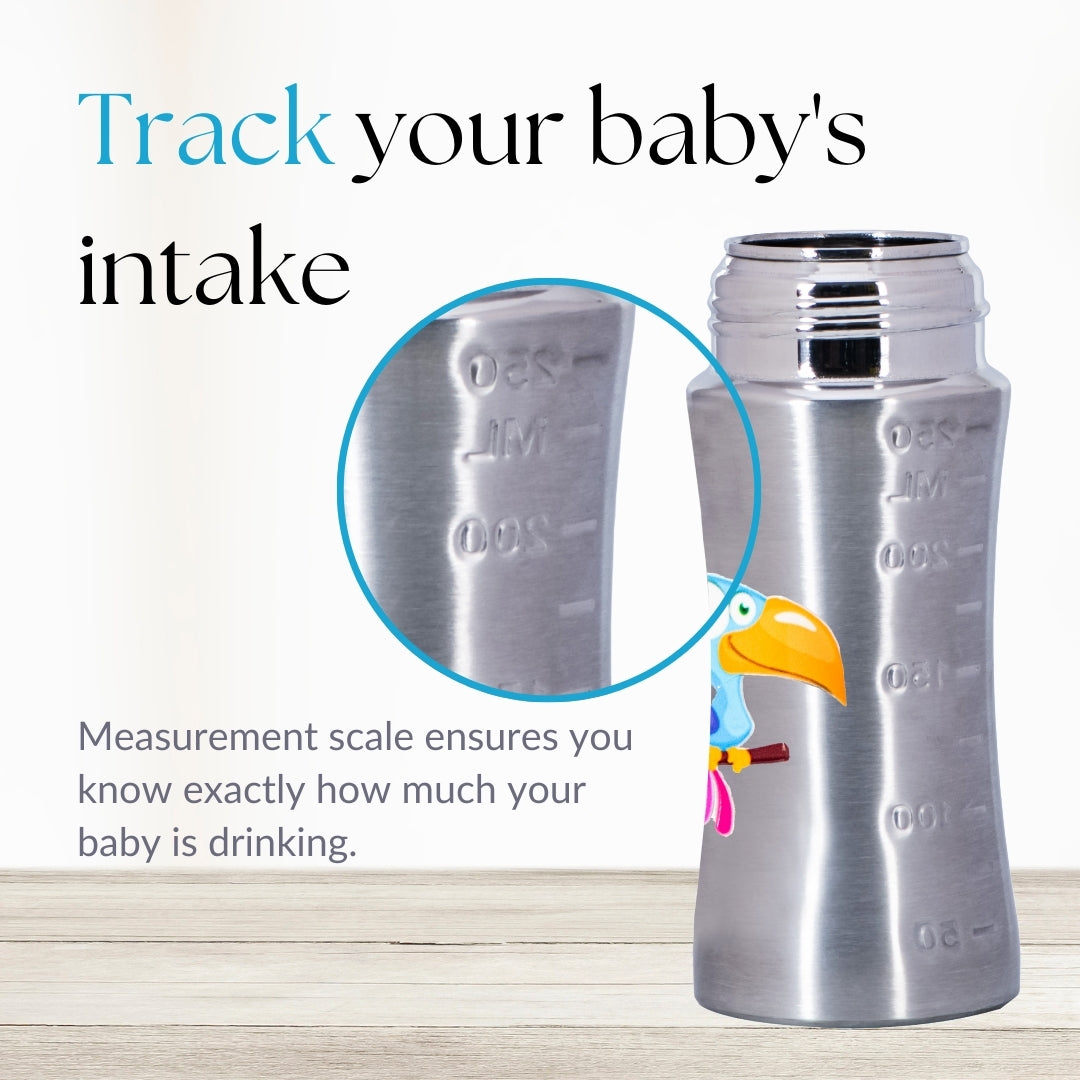 Adore! Trion 3 Stage Premium Stainless Steel Printed Feeding bottles are manufactured from 304 (18/8) SS Food Grade Material with a Food Grade Silicone Teat, Spout, and Straw. Multi Usage: The Flexi Soft Silicone teat acts as Feeding Bottle. In the Next stage, replace the teat with Flexi soft silicone spout to use as a Spout Sipper Cup. In the Next stage, replace the Spout with Flexi soft Silicone straw to use as a Straw Sipper Cup. Moms' Feel - The Flexi Soft Teat, Spout, and Straw are manufactured from super soft and flexible Food grade silicone and the same shape as mom's nursing nipple for a familiar fit. A Matte surface enables the baby to get a secure and continuous latch.