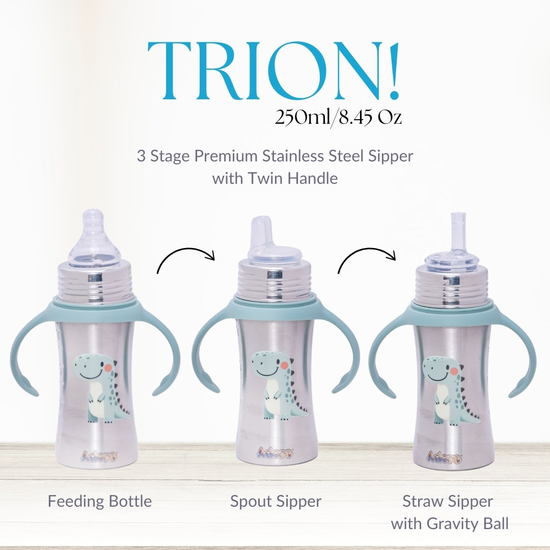 Adore! Trion 3 Stage Premium Stainless Steel Printed Feeding bottles are manufactured from 304 (18/8) SS Food Grade Material with a Food Grade Silicone Teat, Spout, and Straw. Multi Usage: The Flexi Soft Silicone teat acts as Feeding Bottle. In the Next stage, replace the teat with Flexi soft silicone spout to use as a Spout Sipper Cup. In the Next stage, replace the Spout with Flexi soft Silicone straw to use as a Straw Sipper Cup. Moms' Feel - The Flexi Soft Teat, Spout, and Straw are manufactured from super soft and flexible Food grade silicone and the same shape as mom's nursing nipple for a familiar fit. A Matte surface enables the baby to get a secure and continuous latch.