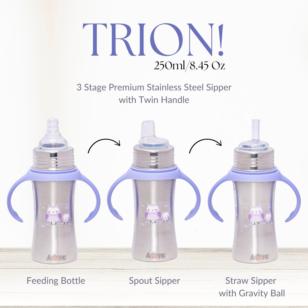 Adore! Trion 3 Stage Premium Stainless Steel Printed Feeding bottles are manufactured from 304 (18/8) SS Food Grade Material with a Food Grade Silicone Teat, Spout, and Straw. Multi Usage: The Flexi Soft Silicone teat acts as Feeding Bottle. In the Next stage, replace the teat with Flexi soft silicone spout to use as a Spout Sipper Cup. In the Next stage, replace the Spout with Flexi soft Silicone straw to use as a Straw Sipper Cup. Moms' Feel - The Flexi Soft Teat, Spout, and Straw are manufactured from super soft and flexible Food grade silicone and the same shape as mom's nursing nipple for a familiar fit. A Matte surface enables the baby to get a secure and continuous latch.