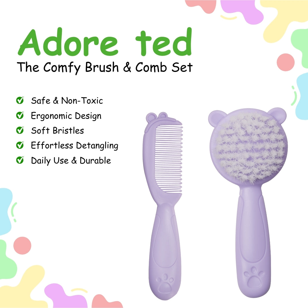 Adore presents TED- The Comfy hair brush and comb set for kids, The hair brush has premium quality soft nylon bristles. The comb tooth has round edges to avoid scratching delicate baby scalp. The set is made with Non Toxic, BPA Free material.
