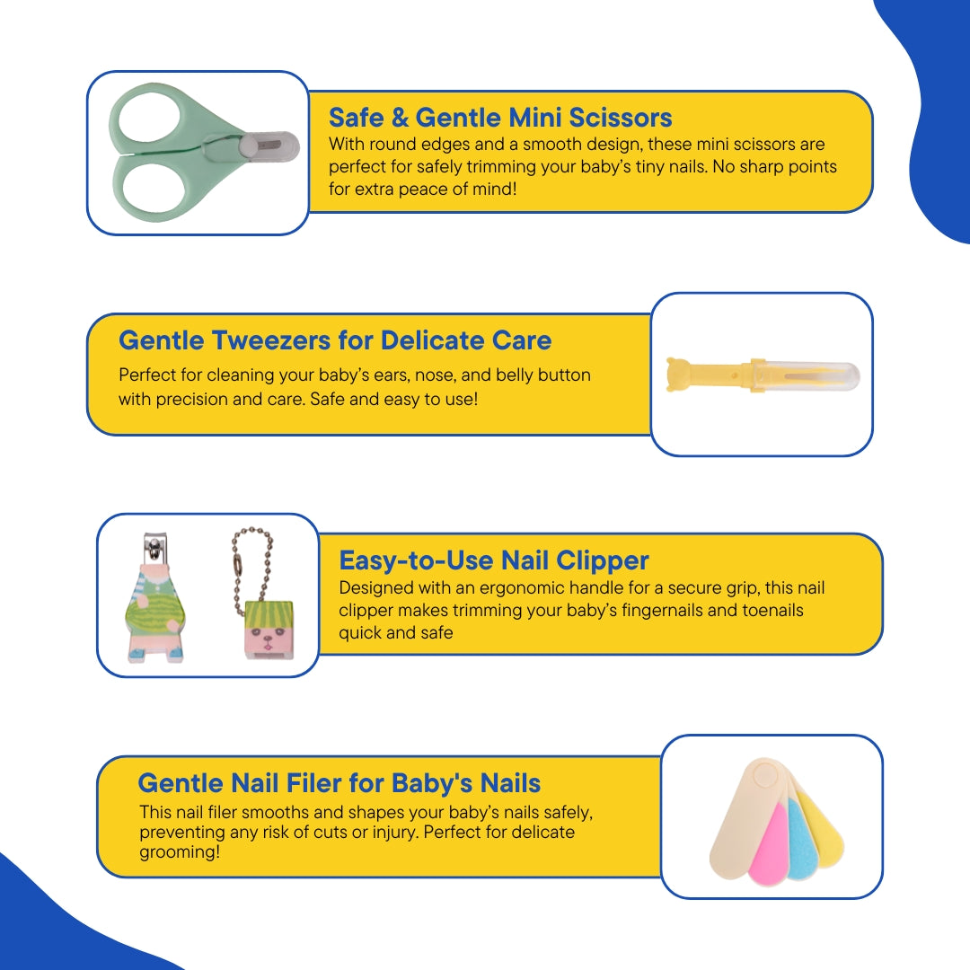 Adore Advanced TETRAD! The Mini Grooming Kit has been meticulously crafted to the highest safety standards. This set consists of a Mini Scissor with head case, Nail Filer, Tweezers, and a Character Nail Clipper. This set is lightweight, compact allows you to carry it anywhere and use it whenever. It is designed with no sharp edges, making it safe for your baby.