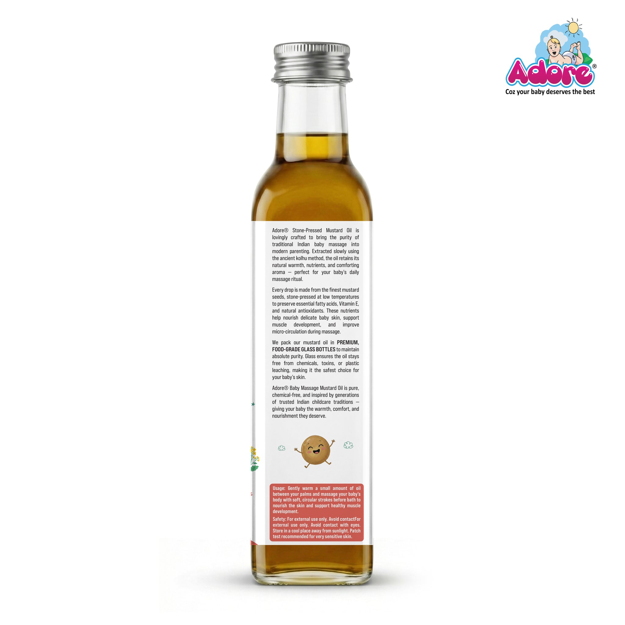 Adore Pure & Premium Cold Pressed Mustard Oil is extracted using traditional cold-press methods to retain its natural nutrients and strong aroma. Known for its naturally warming properties, mustard oil has been traditionally used for body massage to support circulation and relieve dryness.