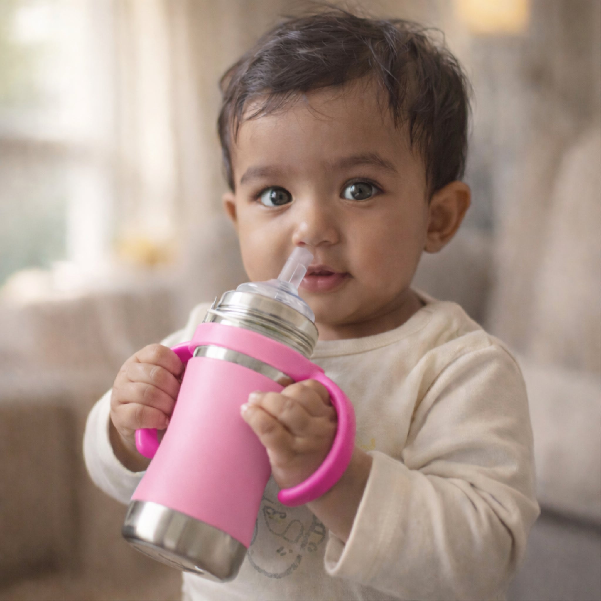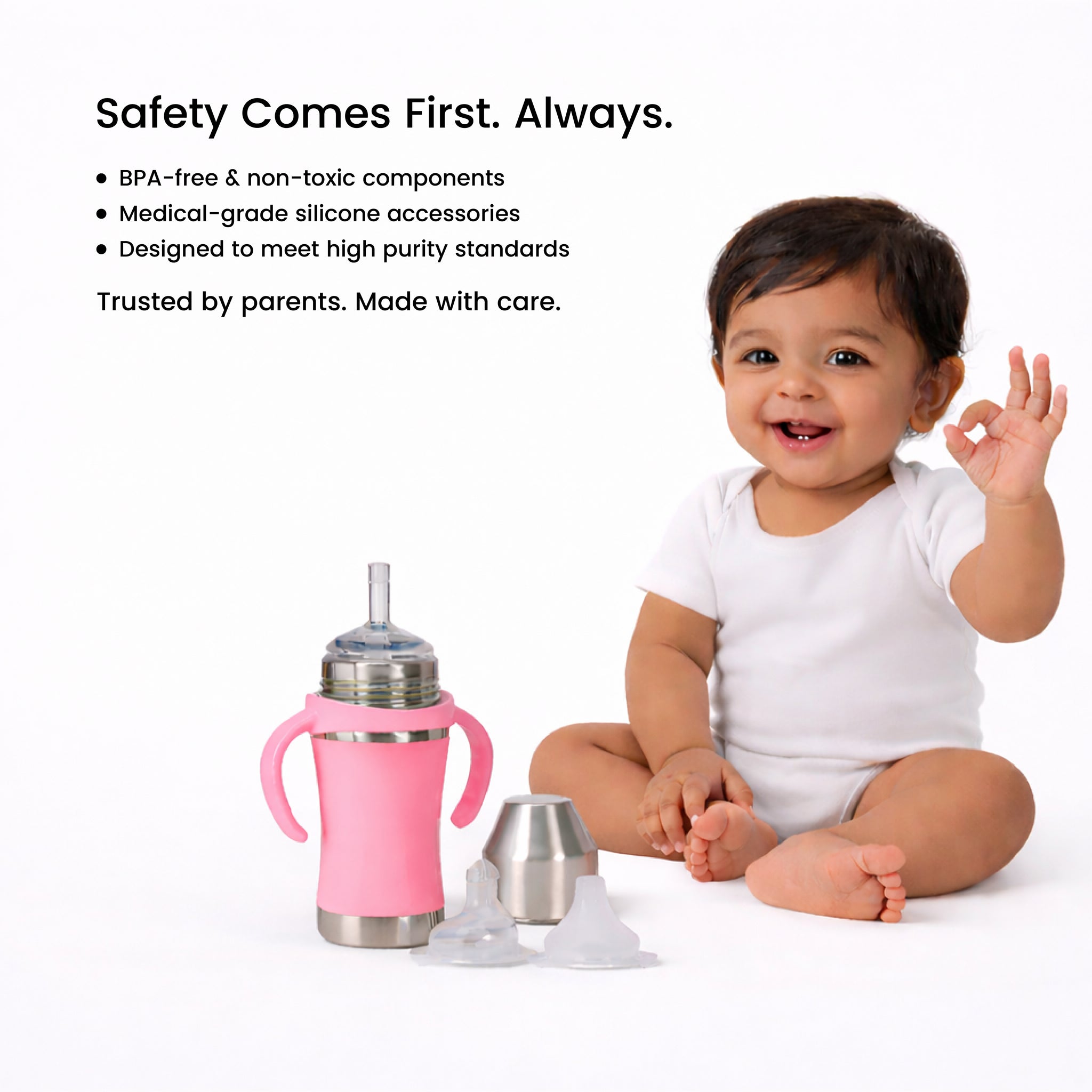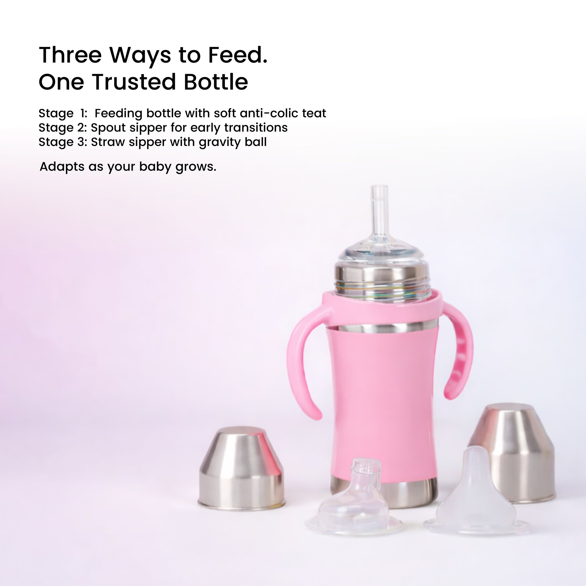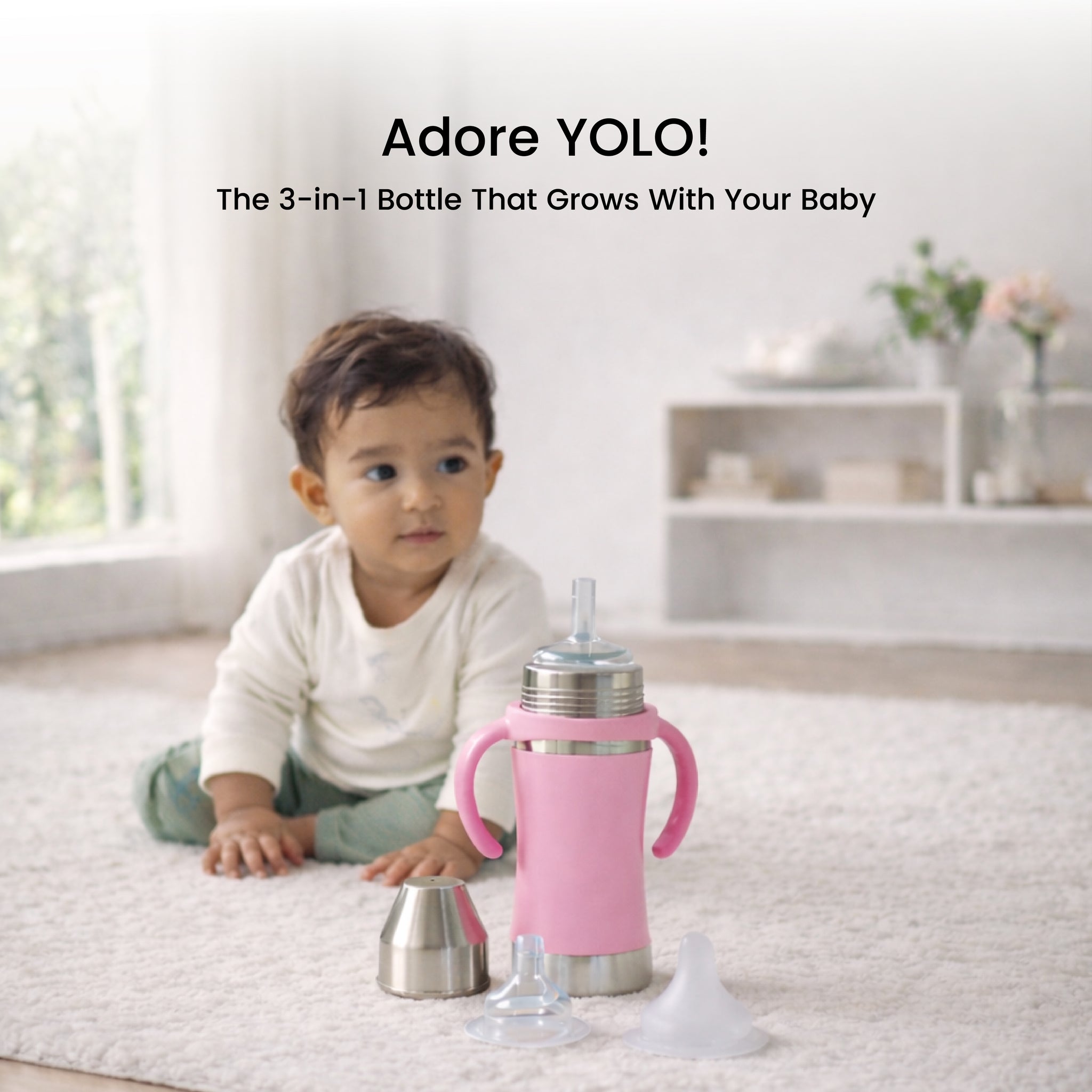 Adore YOLO! 3-in-1 Stainless Steel Feeding Bottle is made from 304 (18/8) food-grade stainless steel and grows with your baby through three stages—feeding bottle, spout sipper, and straw sipper with gravity ball. Designed with soft medical-grade silicone accessories, an anti-colic teat, and a detachable handle, it ensures safe, hygienic, and leak-proof feeding. Dishwasher safe, sterilizer friendly, and ideal from birth onwards for a comfortable, mess-free feeding experience.