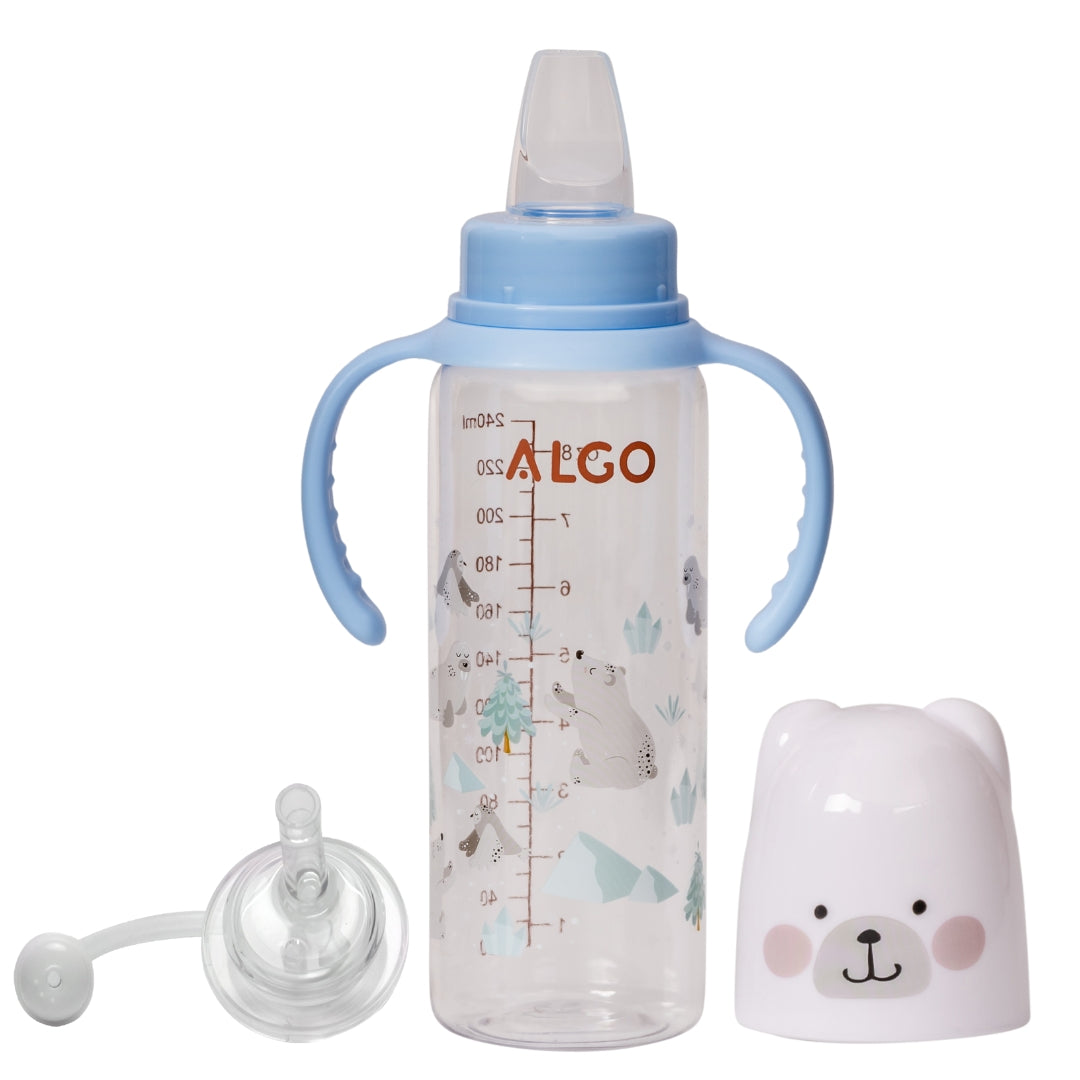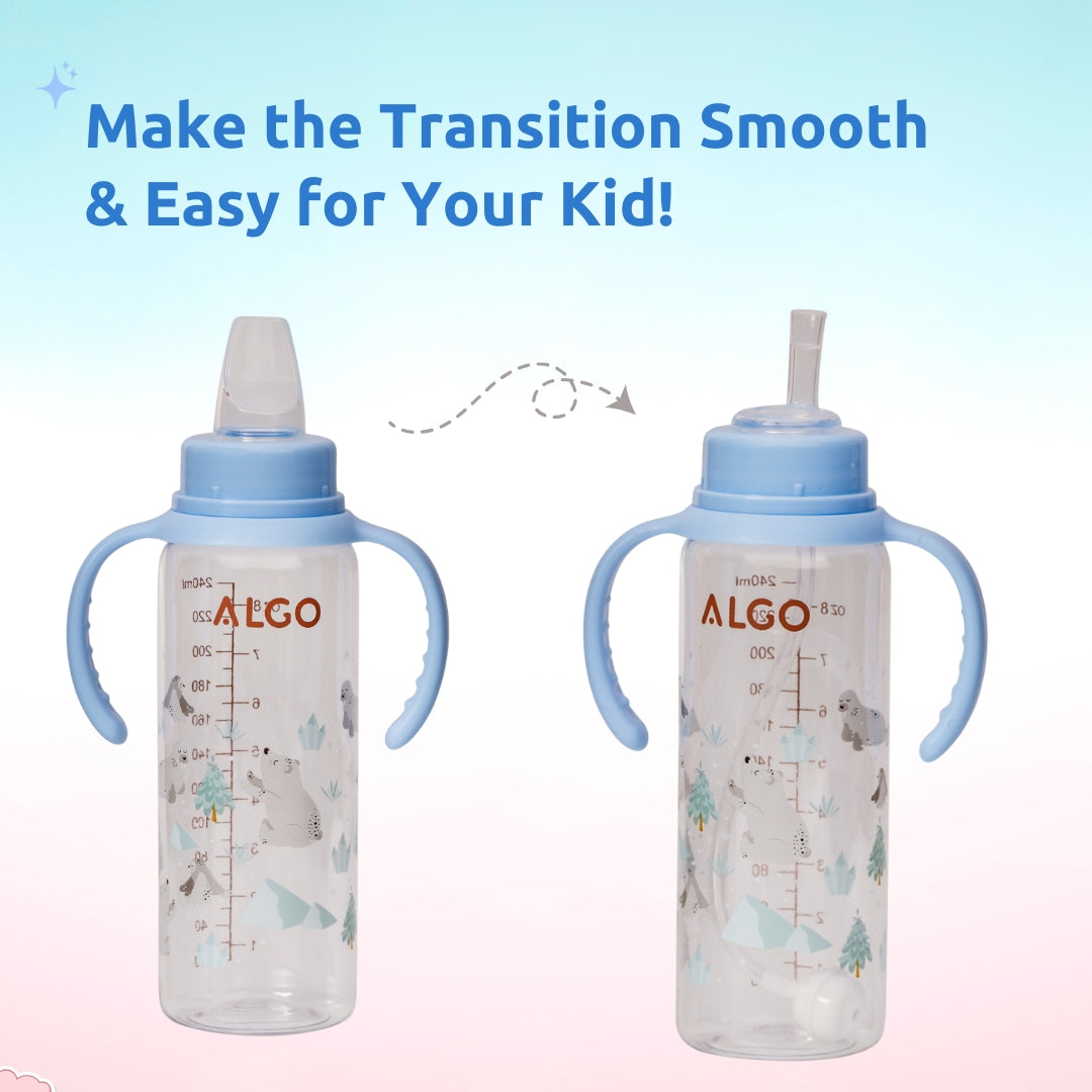 Adore ALGO Snr 2 Stage Baby Spout & Straw Sipper with Gravity Ball is processed from food-grade material using state-of-the-art machinery. This sipper has been designed ergonomically. This features a food-grade silicon Spout and Straw with Gravity Ball that is safe for babies and is Sterilisable. The Twin Handle makes it easy for the babies to transform from Spout sipper to Straw Sipper. This is spill-proof, Lightweight, Easy to Handle, and Dishwasher Safe.