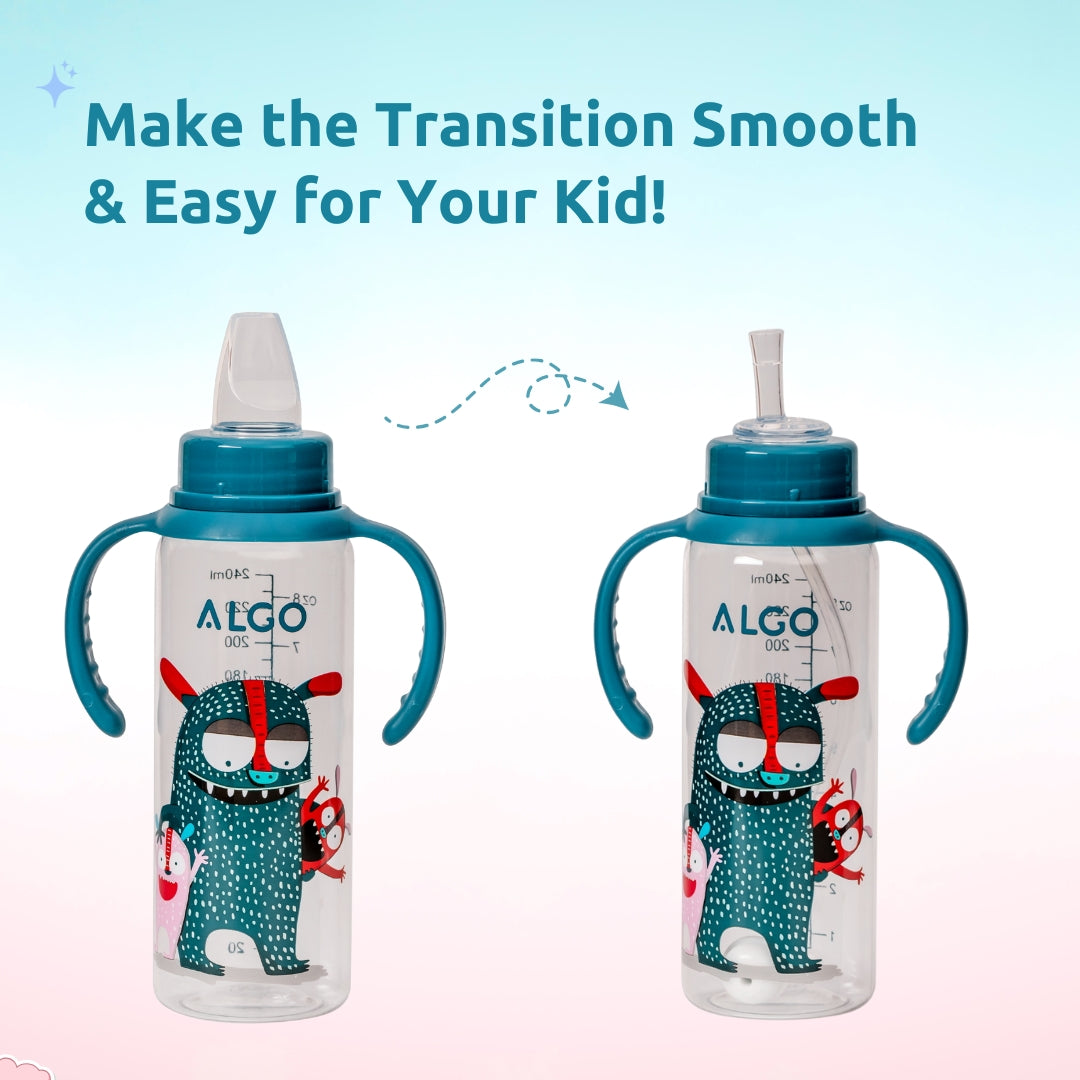 Adore ALGO Snr 2 Stage Baby Spout & Straw Sipper with Gravity Ball is processed from food-grade material using state-of-the-art machinery. This sipper has been designed ergonomically. This features a food-grade silicon Spout and Straw with Gravity Ball that is safe for babies and is Sterilisable. The Twin Handle makes it easy for the babies to transform from Spout sipper to Straw Sipper. This is spill-proof, Lightweight, Easy to Handle, and Dishwasher Safe.