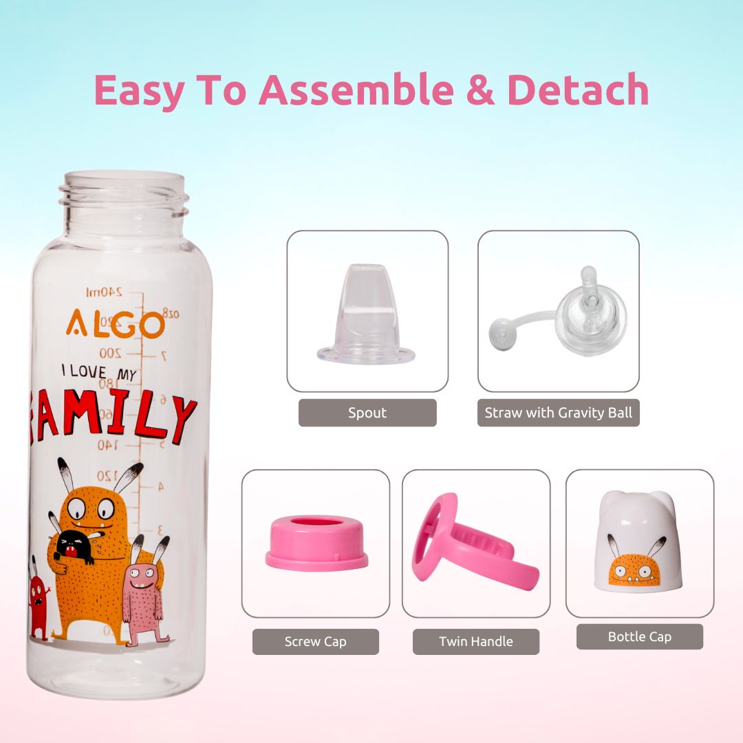 Adore ALGO Snr. 2 in 1 Baby Silicon Spout & Straw Sipper with Gravity Ball & Twin Handle - 250ml- Family Theme Pink