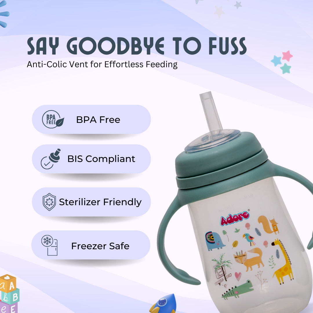 Adore Scotland Wide neck Soft Straw Sipper with Twin Handle-250ml- Green