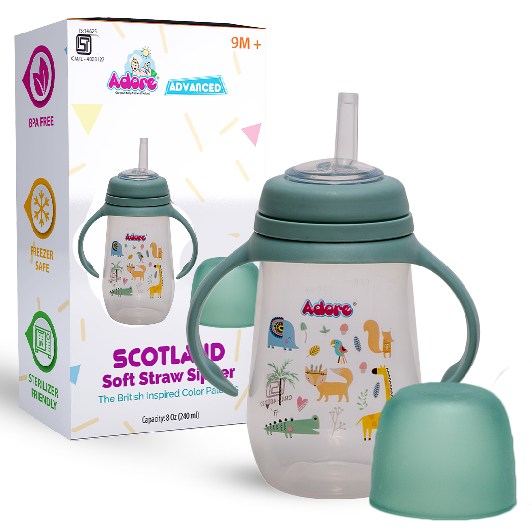 Adore Scotland Soft Straw sipper with Twin Handle has been crafted to the highest safety standards. This is BPA Free, Non-Toxic, Spill Proof, Dishwasher Safe, Sterilizer Friendly, and comes with a detachable handle. This Soft Silicon Straw helps your child transition from a Spout sipper bottle. Ideal for children from 9 months onwards.
