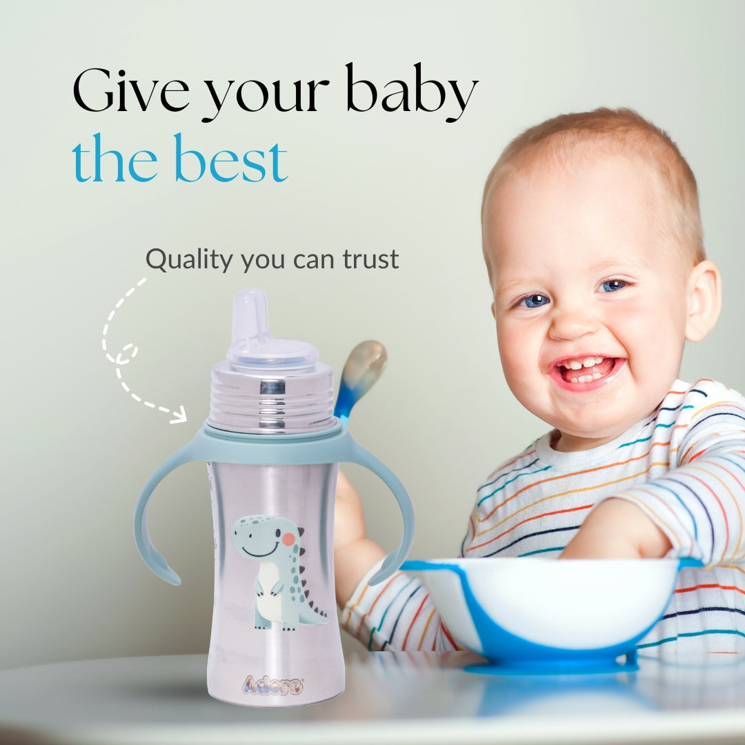 Adore® Twilight! 2 Stage Stainless Steel Printed Sipper are manufactured from 304 (18/8) SS Food Grade Material with a Food Grade Spout and Silicone Gravity Ball Straw. Fix the Flexi soft silicone spout to use it as Spout Sipper. In Next stage, replace the Spout with Flexi soft Silicone straw to use it as a Straw Sipper. This bottle keeps growing with your baby to have a perfect feeding experience.