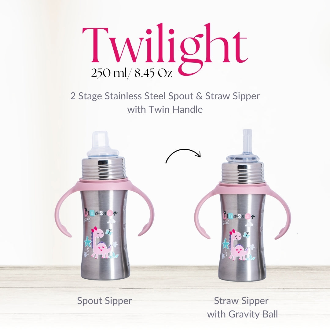 Adore Twilight 2in 1 Stainless Steel Sipper with Twin Handle 250ml - Pink Dino