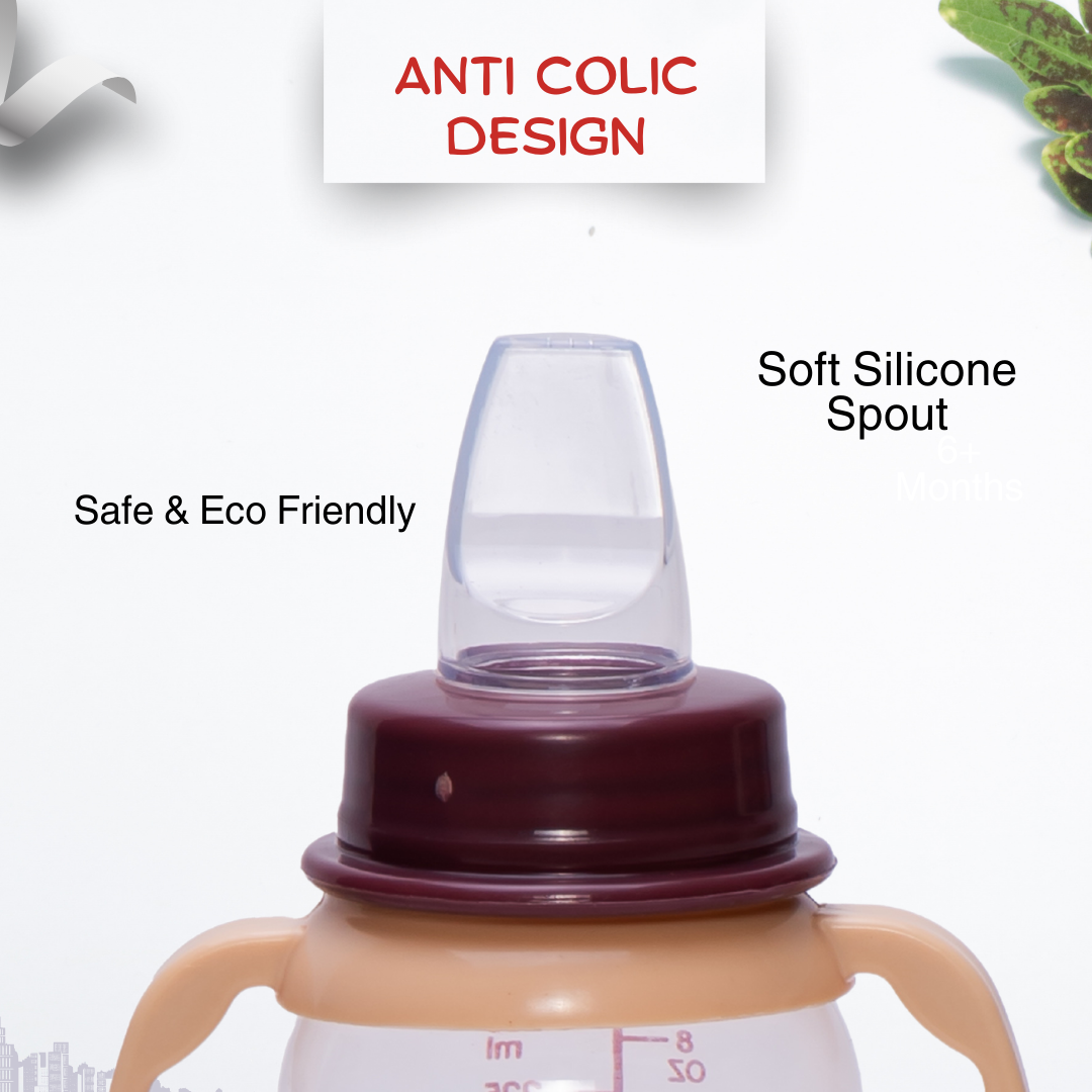 Adore Yeah!Character Hood Baby Soft Spout Sipper with Twin Handle is processed from food-grade material using state-of-the-art machinery. This sipper has beendesigned ergonomically. This features Food grade silicon Spout that is safe forbabies and is Sterilisable. The Twin Handle makes it easy for the babies totransform from feeding bottles to spout sippers. This is spill-proof, Lightweight, Easy to Handle, and Dishwasher Safe.