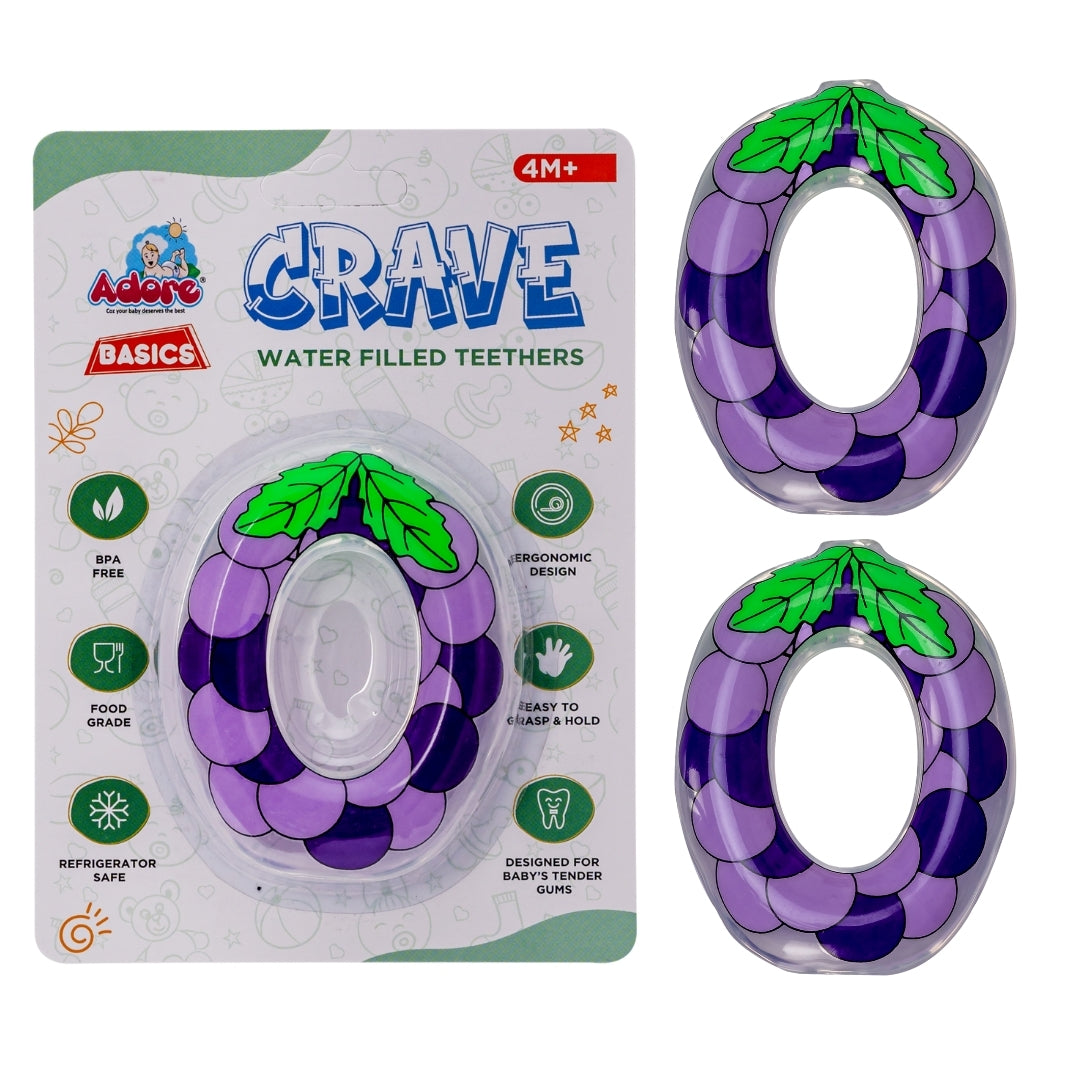 Adore® Basics CRAVE Water filled teethers are manufactured from food grade material, which is safe and good for baby teething phase. These teethers are filled with highly purified RO distilled water which is baby safe. These Teethers are manufactured using world class, state of the art machinery. Designed to make sure they are easily handled by the babies and hold, gum, and chew and the textured surface massages sensitive areas. Provides extra relief for Soothing, swollen and sensitive gums.