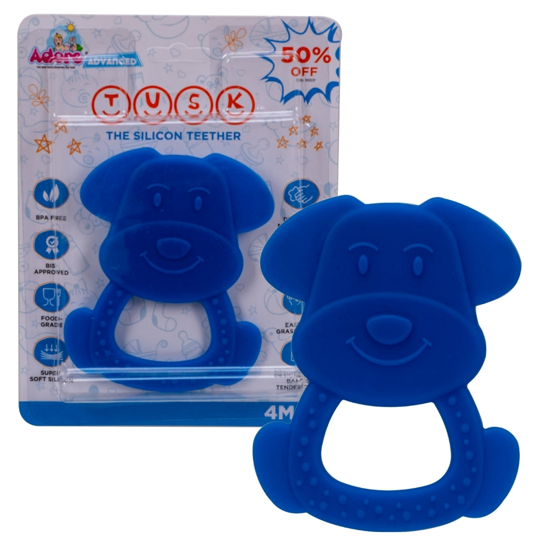 Adore® TUSK- The Silicon teether is manufactured from food-grade silicon, which is safe and good for the baby teething phase. These Teethersare manufactured using world-class, state-of-the-art machinery. Designed tomake sure they are easily handled by the babies and hold, gum, and chew, and thetextured surface massages sensitive areas. Provides extra relief for Soothing,swollen and sensitive gums.