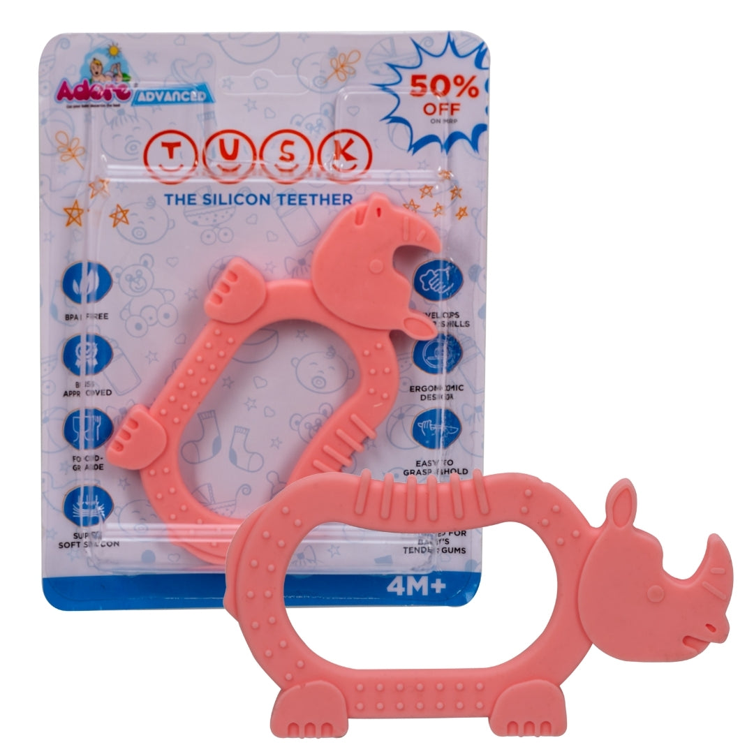 Adore® TUSK- The Silicon teether is manufactured from food-grade silicon, which is safe and good for the baby teething phase. These Teethersare manufactured using world-class, state-of-the-art machinery. Designed tomake sure they are easily handled by the babies and hold, gum, and chew, and thetextured surface massages sensitive areas. Provides extra relief for Soothing,swollen and sensitive gums.