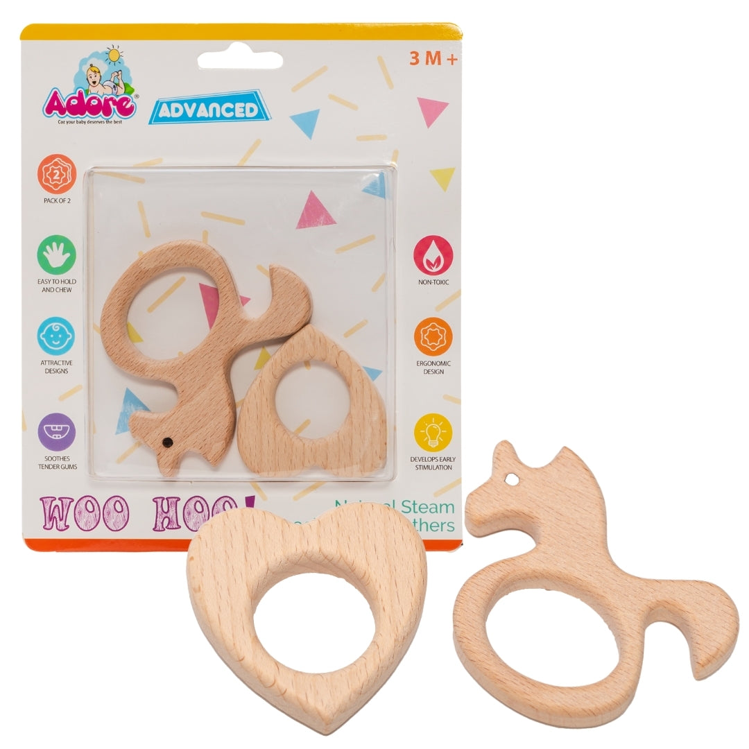 Adore Advanced Woo Hoo! Wooden Teethers have been processed from handpicked natural steam Beechwood that is non-toxic and free from harmful leads, metals, BPA, chemicals, or phthalates. Beechwood teethers naturally contain antimicrobial and antibacterial properties. This helps to combat any germs making their way to the baby's mouth. These Wooden Teethers satisfy babies' teething needs and as well boost their immunity. Grasping wood helps the baby develop better motor skills and sensorial stimulation. Designed to soothe baby's delicate gums during the teething period.
