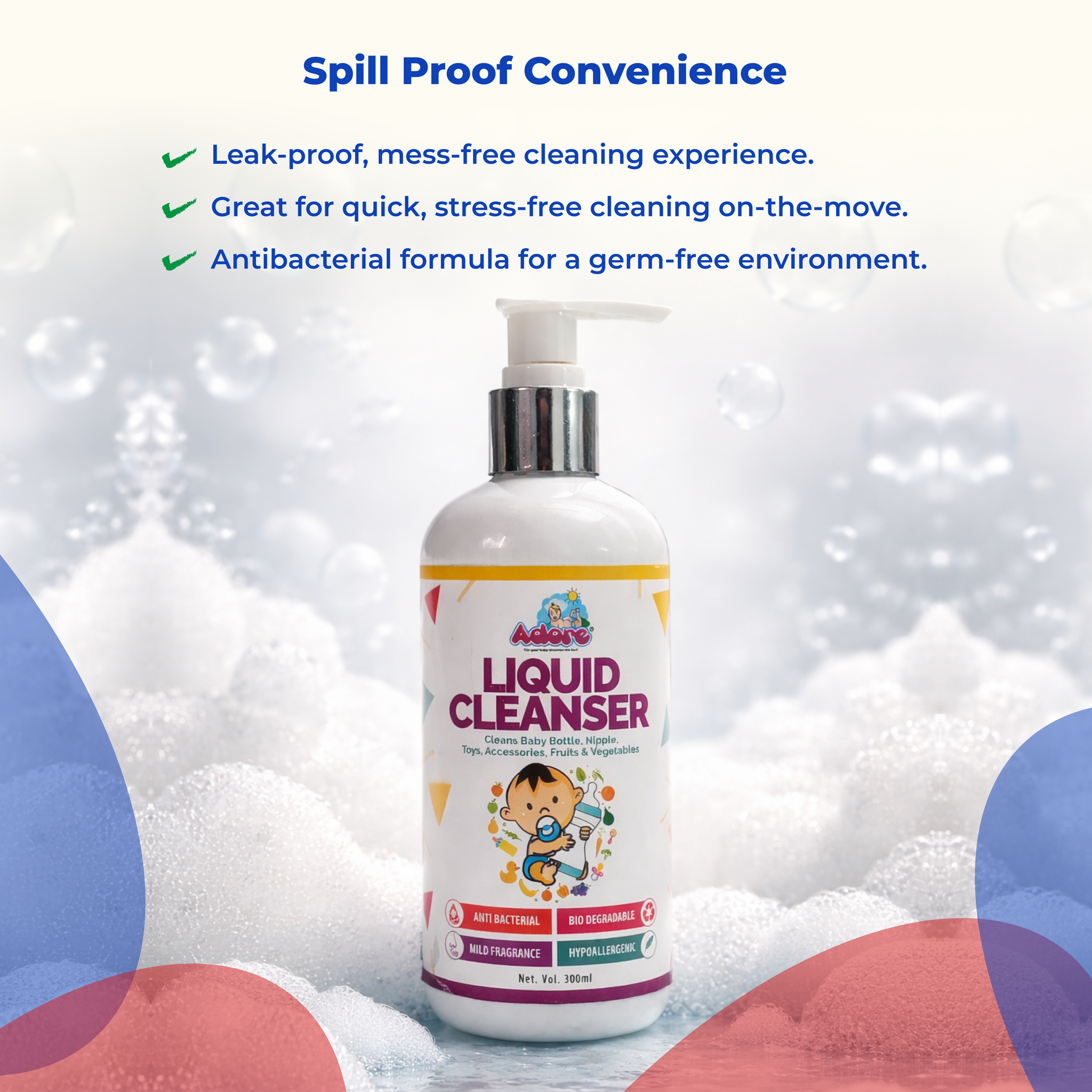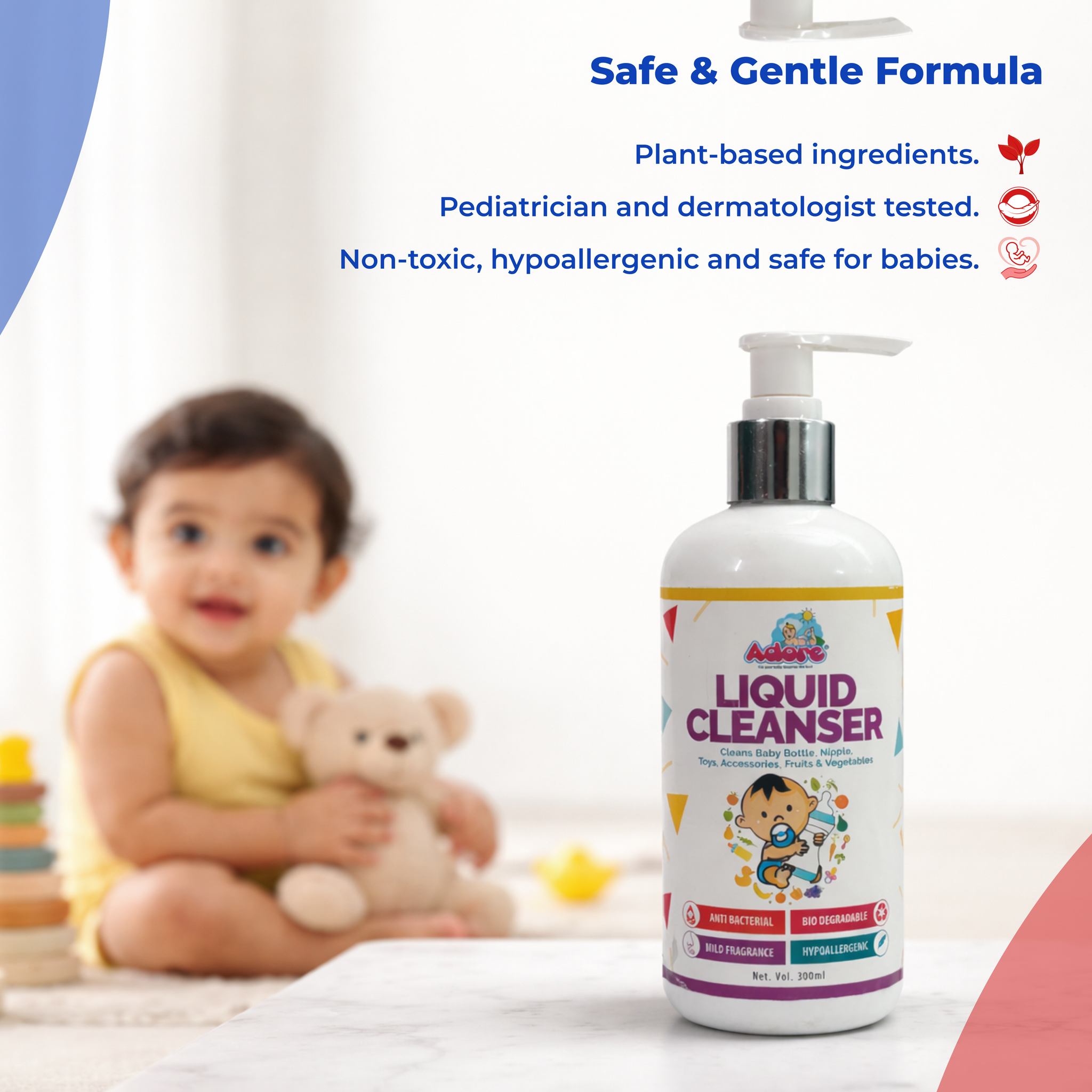 Adore Baby Bottle & Dish Liquid effectively cleans baby bottles, sippy cups, pacifiers, and breast pump components by removing stubborn milk residue and odors caused by breast milk and formula. Independent lab tests prove that Adore Baby Cleanser removes up to 50% more milk film and odor than other leading brands. Made with plant-based ingredients, it is non-toxic, hypoallergenic, and free from harsh chemicals—pediatrician and dermatologist tested, and never tested on animals. Available in multiple sizes, including refill pouches and travel packs, it offers safe, worry-free, and convenient cleaning for every parent.