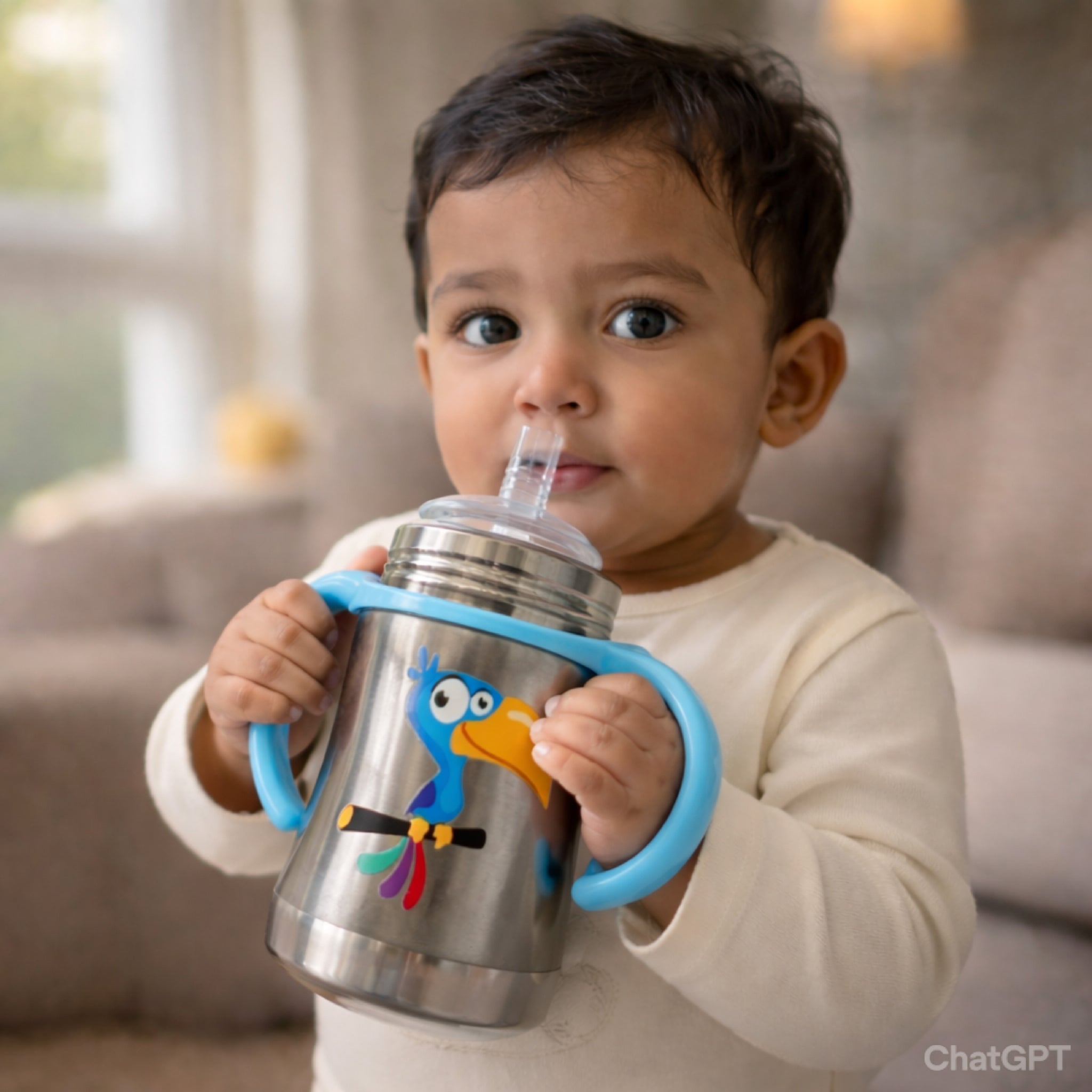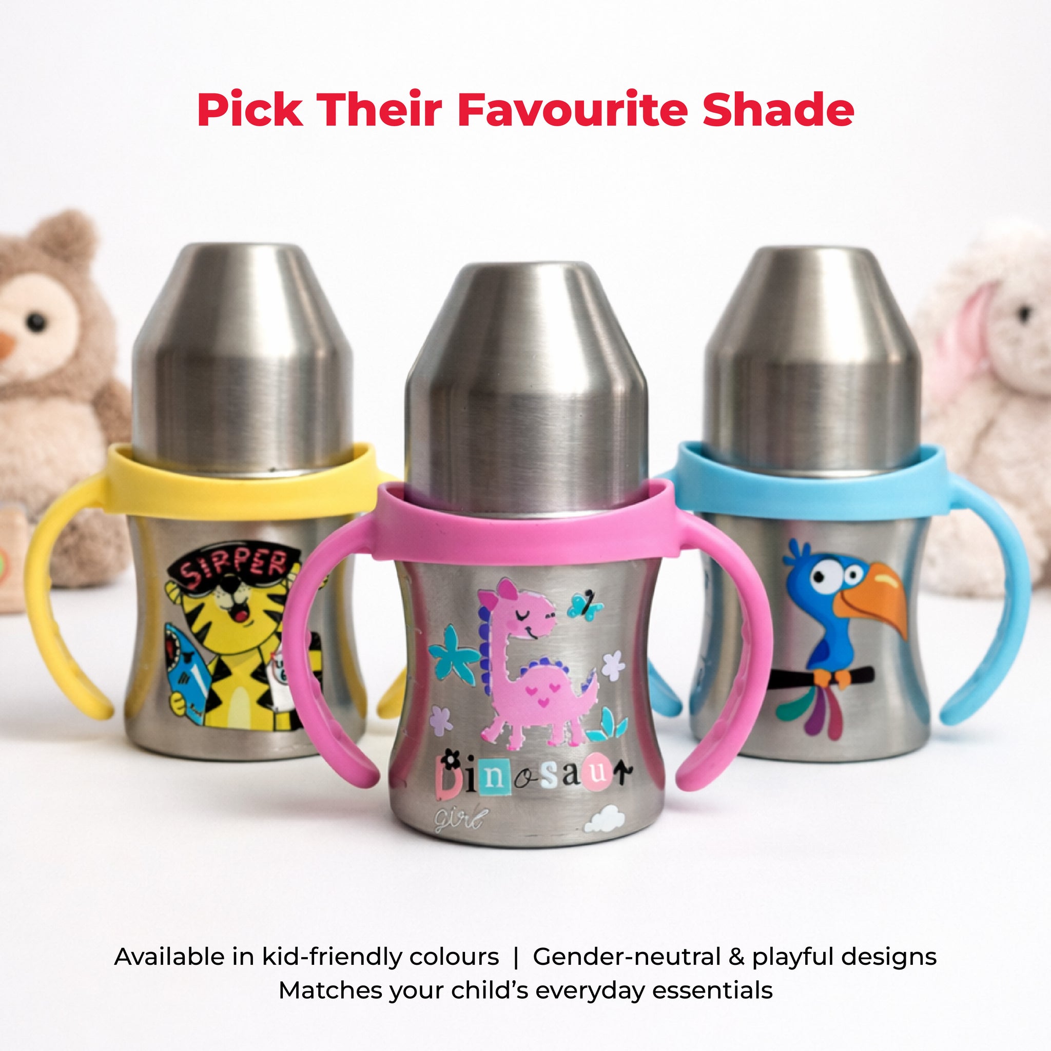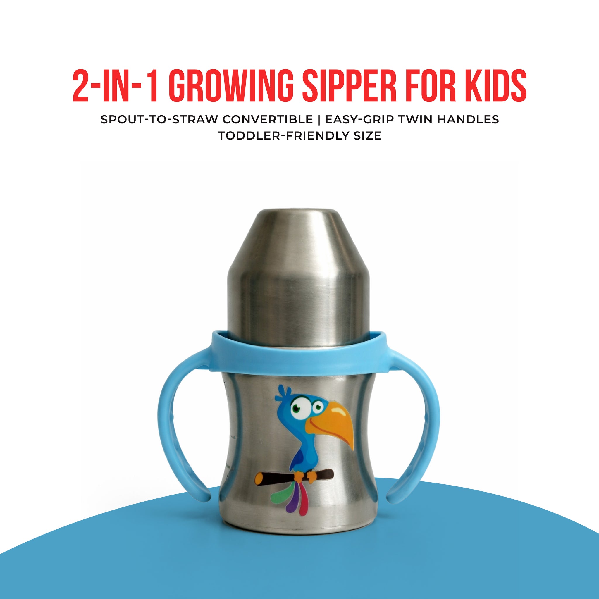 Adore® Twilight Jr. 2 Stage Stainless Steel Printed Sipper are manufactured from 304 (18/8) SS Food Grade Material with a Food Grade Spout and Silicone Gravity Ball Straw. Fix the Flexi soft silicone spout to use it as Spout Sipper. In Next stage, replace the Spout with Flexi soft Silicone straw to use it as a Straw Sipper. This bottle keeps growing with your baby to have a perfect feeding experience.