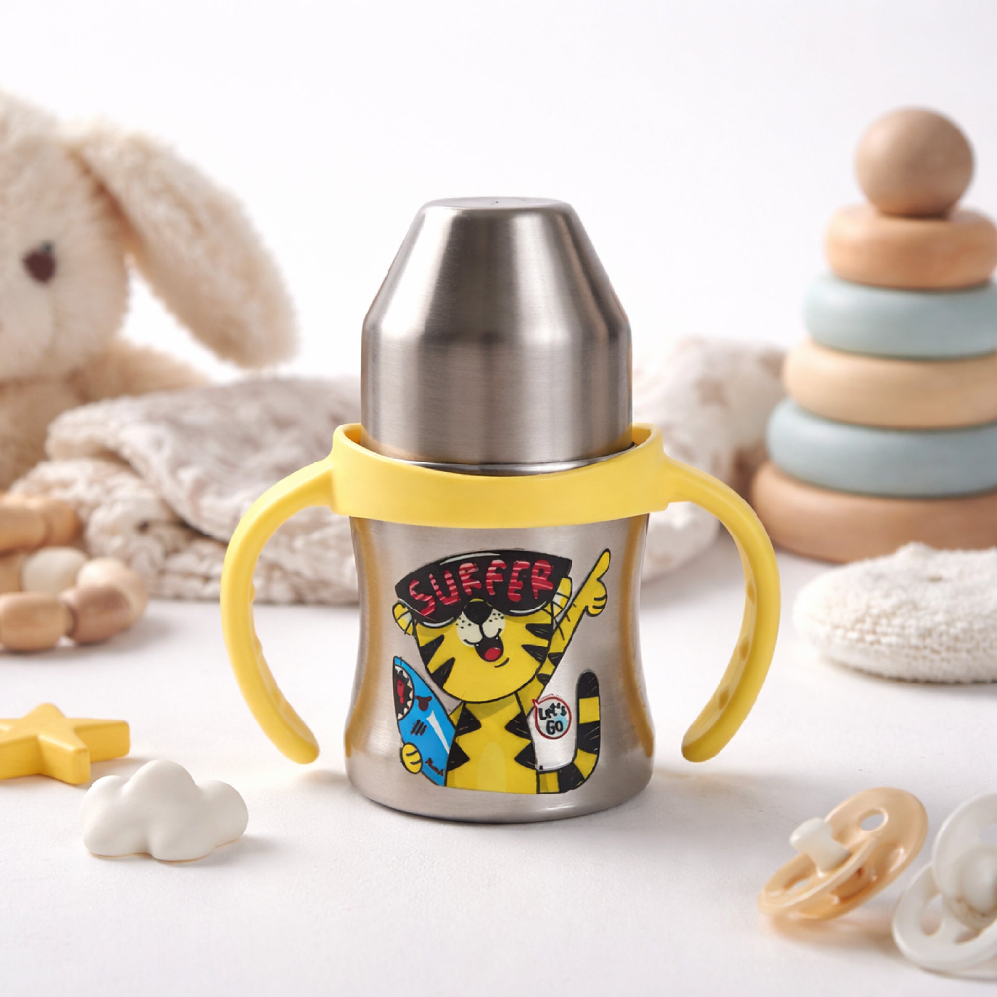 Adore® Twilight Jr. 2 Stage Stainless Steel Printed Sipper are manufactured from 304 (18/8) SS Food Grade Material with a Food Grade Spout and Silicone Gravity Ball Straw. Fix the Flexi soft silicone spout to use it as Spout Sipper. In Next stage, replace the Spout with Flexi soft Silicone straw to use it as a Straw Sipper. This bottle keeps growing with your baby to have a perfect feeding experience.